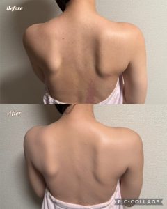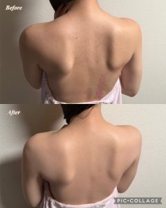 旦那様と一緒にご来店くださり、花嫁様が気にされておりましたお背中のニキビ痕、アザをエアブラシで綺麗にさせて頂きました♪