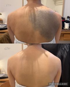 結婚式当日に式場様へ出張させて頂き、お背中の生まれつきの蒙古斑をエアブラシで隠すボディメイクをさせて頂きました。