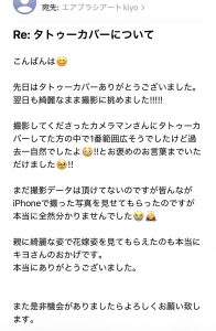 『結婚式もですが、ちょこちょこお世話になると思いますので宜しくお願いします!』と仰ってくださり、エアブラシアートキヨのタトゥーカバーの技術を認めてくださったことがめちゃくちゃ嬉しかったです( ´ ▽ ` )ノ