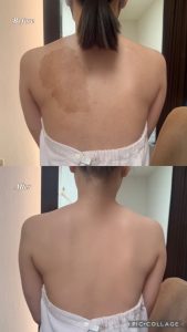 結婚式当日に生まれつきのお背中のアザをエアブラシとお肌に優しいリキッドファンデーションで一時的に綺麗にさせて頂きました♪