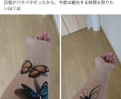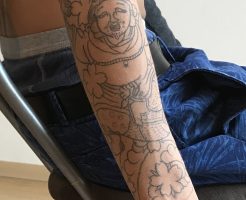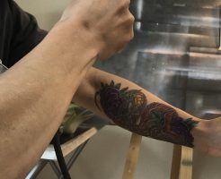 今日はね、なななーんと! 関東は横浜から大阪まで足を運んでくださり、3D系フェイクタトゥーの、スキルアップエアーブラシスクールの受講に来てくれました♪ 朝からデザインの製作方法から始めて、実際にご自身の腕に施術をしていき・・・