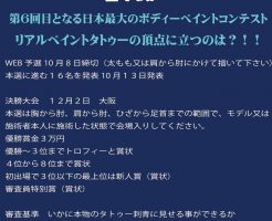 こんにちは、エアーブラシアートキヨです、世間では、お盆休みに突入で、大阪も普段にまして、人で賑わってました♪ 自転車に通り抜けるのに一苦労です♪ さて、 今年もやってきました 第6回リアルペイントタトゥーコンテストが、開・・・